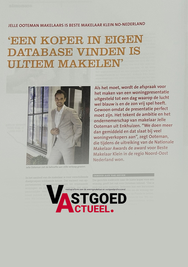We houden je graag op de hoogte van ons aanbod, op de markt én in de stille verkoop! Maak hieronder snel en eenvoudig jouw Jelle Ooteman Makelaars ZoekProfiel aan en ontvang aanbod dat de zoekwensen matcht automatisch in je mailbox.